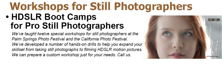 Still Photographers: We were chosen by the Brooks Institute Workshops, the Palm Springs Photo Festival, and the California Photo Festival to train still photographers to enter motion picture camerawork. Above are the ratings of our professional still photographers at the recent Palm Springs Photo Festival.